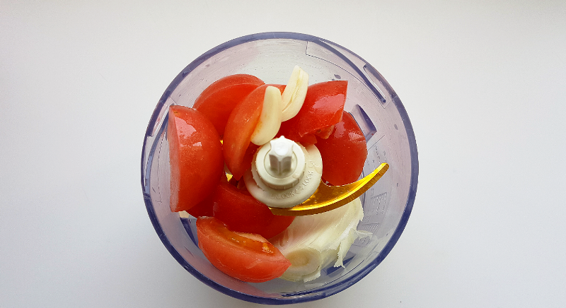 Βάλτε την ντομάτα, το σκόρδο και το κρεμμύδι στο μούλτι και πολτοποιήστε.