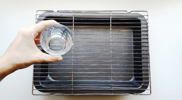 Βάλτε μια σχάρα πάνω από ένα ταψί. Ρίξτε ένα ποτήρι νερό μέσα και, σε αυτό το σημείο, προθερμάνετε τον φούρνο σας στους 200, στον αέρα.