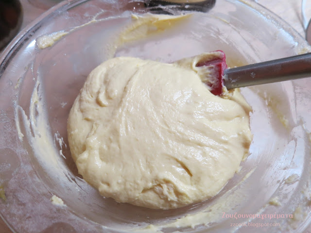 Κοσκινίζουμε το αλεύρι και χτυπάμε λίγο το μείγμα ώστε να έχουμε μία ζύμη πολύ απαλή και μαλακιά.