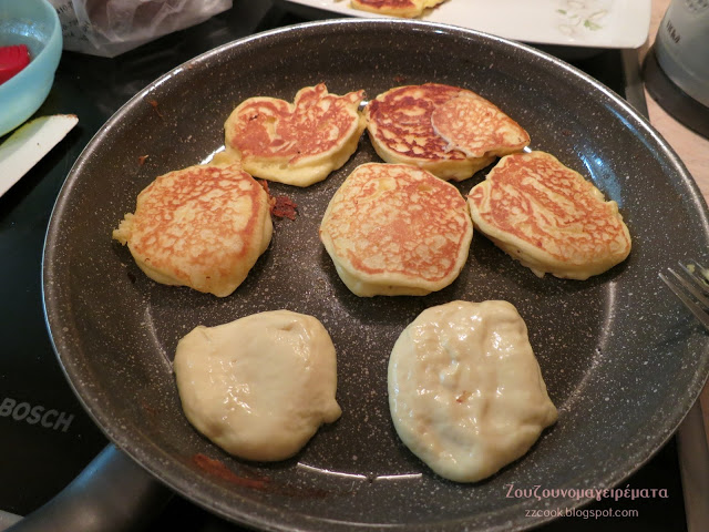 Βάζουμε κουταλιές στο τηγάνι πατάμε λίγο γιατί θα φουσκώσουν, βρέχουμε κάθε φορά το κουτάλι για να ξεκολλάει η ζύμη και να μπορούμε να ακουμπάμε τη ζύμη στο τηγάνι.