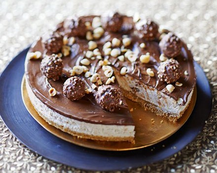 - Για την επικάλυψη και διακόσμηση: Μόλις κρυώσει καλά η γέμιση, λιώνετε τη Nutella σε ένα κατσαρολάκι σε πολύ χαμηλή θερμοκρασία ανακατεύοντας για 3-4 λεπτά μέχρι να ρέει. Το κατεβάζετε από τη φωτιά και το αφήνετε να μισοκρυώσει . Αλείφετε ελαφρά με ένα κουτάλι την επιφάνεια του cheesecake, γαρνίρετε περιμετρικά την επιφάνεια με τα ολόκληρα σοκολατάκια Ferrero Rocher και στο κέντρο γαρνίρετε με τα χοντροκομμένα φουντούκια. Μόλις κρυώσει η Nutella σερβίρετε και το απολαμβάνετε.