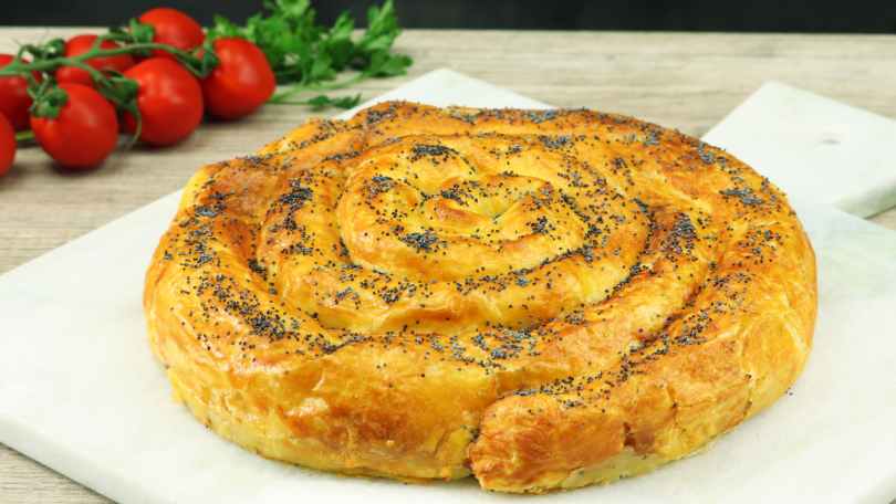 Βάλτε τα όλα σε ένα αντικολλητικό χαρτί φτιάχνοντας μία μεγάλη σπείρα. Αλείψτε την με αβγό και ρίξτε από πάνω σπόρους παπαρούνας.