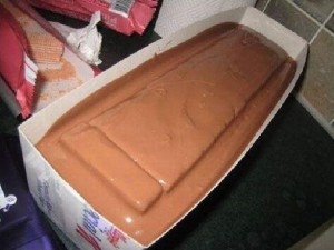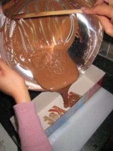 Έπειτα, μόλις δεις ότι έχει λιώσει η σοκολάτα σου, πάρε μια μεγάλη ορθογώνια φόρμα και άπλωσε την καλά μέσα, για να έχεις μια ομοιόμορφη στρώση.