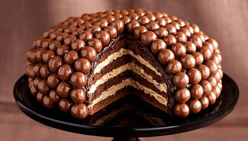 Συνεχίστε την ίδια διαδικασία με το δεύτερο και τρίτο στρώμα παντεσπανιού. Τελειώνετε με το τελευταίο παντεσπάνι. Αλείφετε στη κορυφή και τα τοιχώματα, με τη βοήθεια μιας μαρίζ τη ganache [γκανάς] και διακοσμείτε με τα Maltesers.