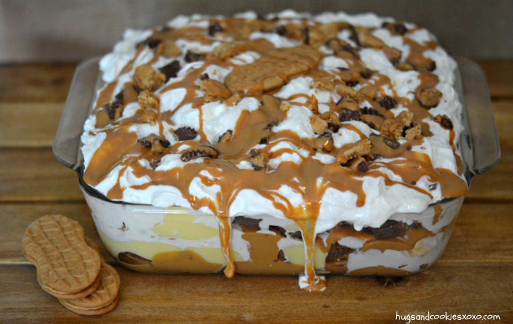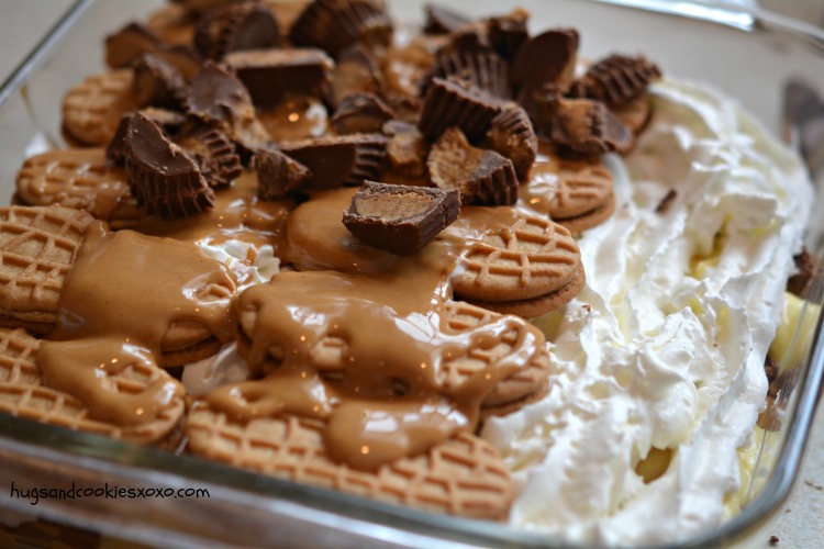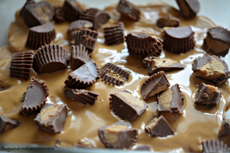 7. Διακοσμήστε την κορυφή με θρυμματισμένα μπισκότα ,κομματάκια από από σοκολατάκια και σταγόνες φυστικοβούτυρου.