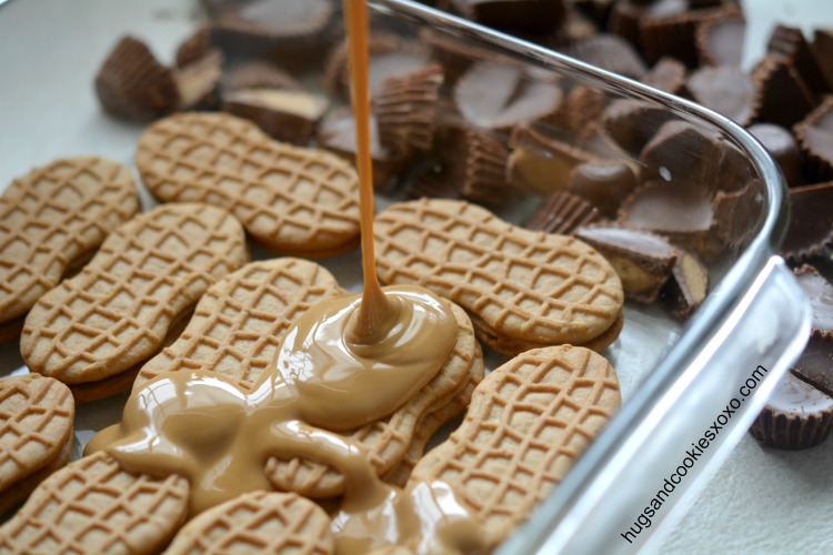 1. Βάλτε κάτω κάτω σε ένα ταψί 8×8 τα μπισκότα βουτύρου.