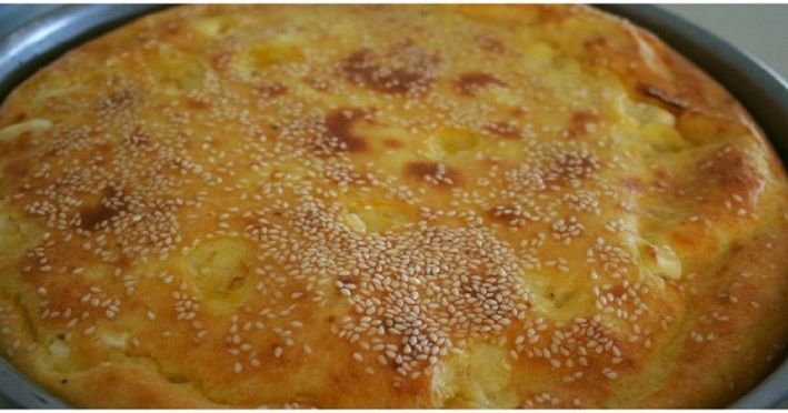 Βάζουμε σε μεγάλο μπολ ή λεκάνη το αλεύρι, το νερό, τα αυγά, το γιαούρτι και το βούτυρο και τα χτυπάμε να γίνουν ένας πηχτός χυλός. Προσθέτουμε τη φέτα τρίβοντας τη με το χέρι και τον δυόσμο και ανακατεύουμε απαλά να πάνε παντού, αλλά να μη λιώσουν. Λαδώνουμε και αλευρώνουμε ένα ταψί ή πυρέξ, ρίχνουμε το μείγμα μέσα και πασπαλίζουμε με το μείγμα σουσαμιών και δύο τρία κουταλάκια βούτυρο επιπλέον. Τοποθετούμε το ταψί σε προθερμασμένο φούρνο στους 180 βαθμούς μέχρι να ροδίσει καλά.