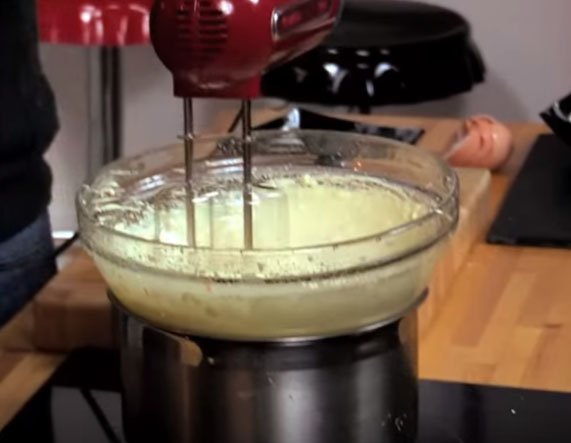 - Βάλτε στο μάτι ένα κατσαρολάκι με νερό μέχρι να βράσει. Μόλις αρχίσει να βράζει χαμηλώστε τη θερμοκρασία έτσι ώστε να σιγοβράζει. Τοποθετήστε πάνω ένα μπολ (Πώς κάνουμε στο μπέν μαρί; αυτό ακριβώς) και προσθέστε τη ζάχαρη, τα αυγά και το ξύσμα πορτοκαλιού. Χτυπήστε μέχρι το μείγμα να γίνει αφράτο και απαλό.