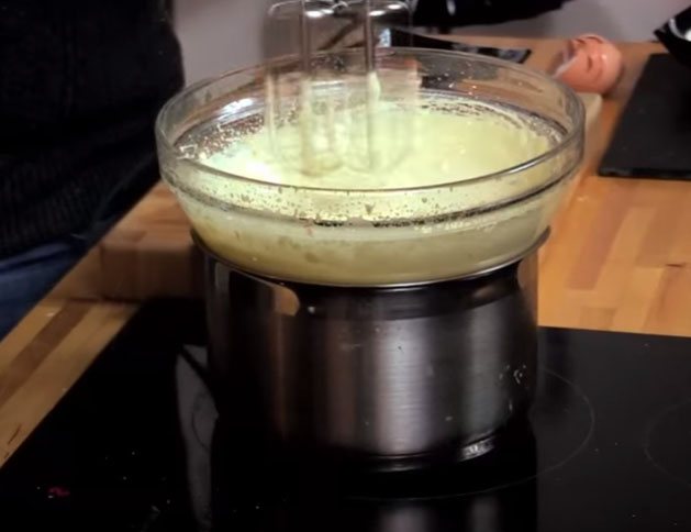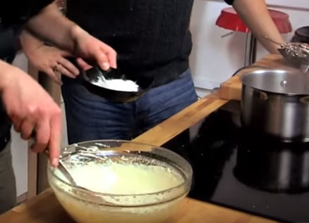- Στη συνέχεια αποσύρετε το μπολ από τη κατσαρόλα και προσθέστε το αλεύρι.