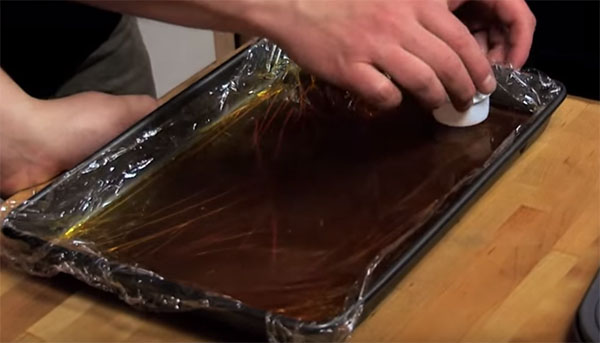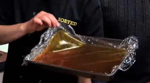 - Φτιάξτε το ζελέ και ρίξτε το σε ταψάκι για να παγώσει επίπεδα και να γίνει λεπτό. Πριν τοποθετήσετε μέσα το ζελέ απλώστε στο ταψάκι με μεμβράνη. Βάλτε το να παγώσει καλά.