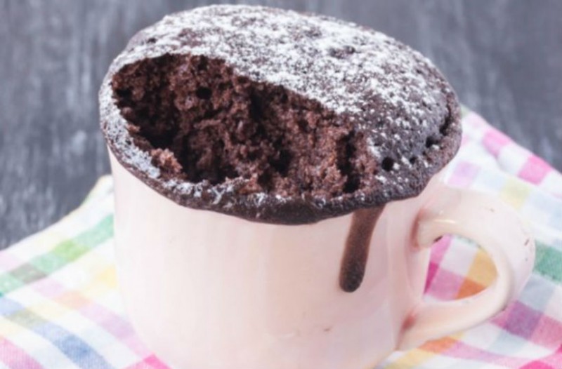 Κατόπιν ρίχνουμε το αλεύρι, τη ζάχαρη, το κακάο, το μπέικιν πάουντερ και το αλάτι και ανακατεύουμε ξανά πολύ καλά. Βάζουμε το φλιτζάνι στον φούρνο μικροκυμάτων για 1 λεπτό σε μεσαία θερμοκρασία. Το “κέικ” θα φουσκώσει, ενώ στο εσωτερικό θα είναι υγρό. Αν το θέλουμε πιο σφιχτό, ψήνουμε για άλλα 10 δευτερόλεπτα.