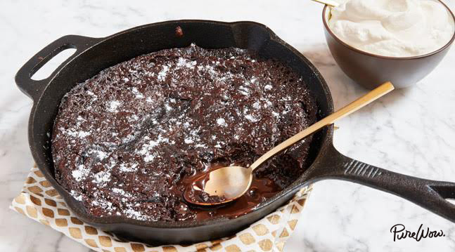 Η παρακάτω φοβερή συνταγή είναι μια παραλλαγή του κέικ σοκολάτας που όμως αντί να μπει σε ταψί για κέικ, ψήνεται και σερβίρεται σε τηγάνι που μπαίνει στο φούρνο!