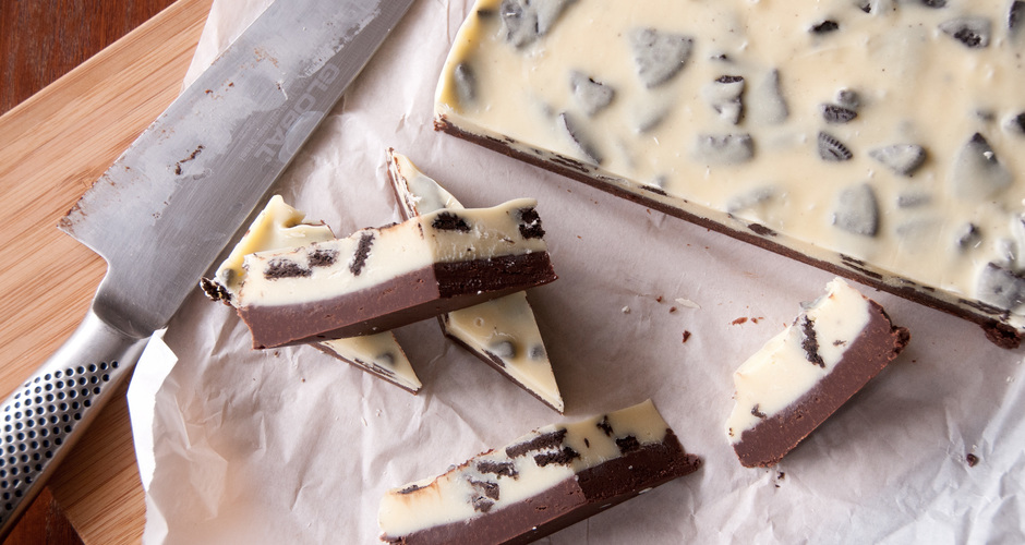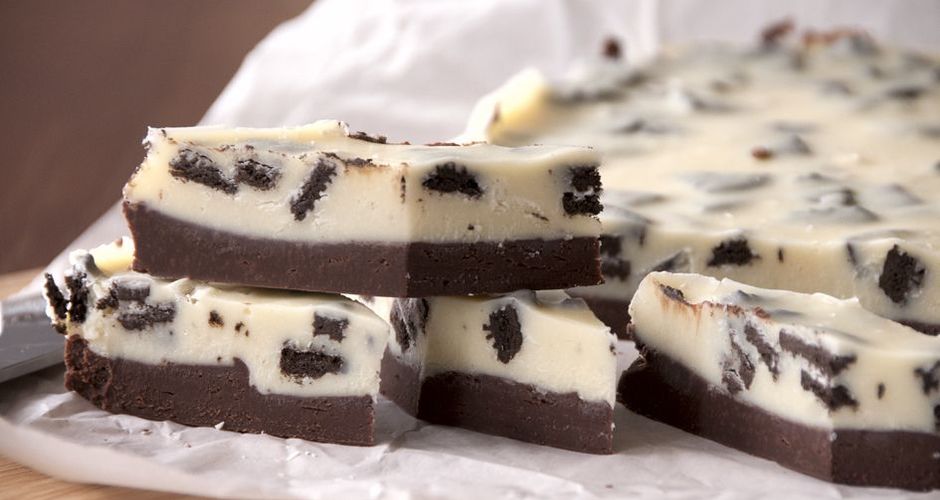 Ρίχνουμε το μείγμα σε ένα ταψάκι που έχουμε στρώσει λαδόκολλα 20×20εκ. ή στρογγυλό διαμέτρου 20εκ. και το ισιώνουμε με μία σπάτουλα. Βάζουμε στο ψυγείο για τουλάχιστον 1 ώρα και στη συνέχεια σε ένα ακόμη μπεν μαρί λιώνουμε τη λευκή κουβερτούρα μαζί με το άλλο ζαχαρούχο γάλα και το βούτυρο.