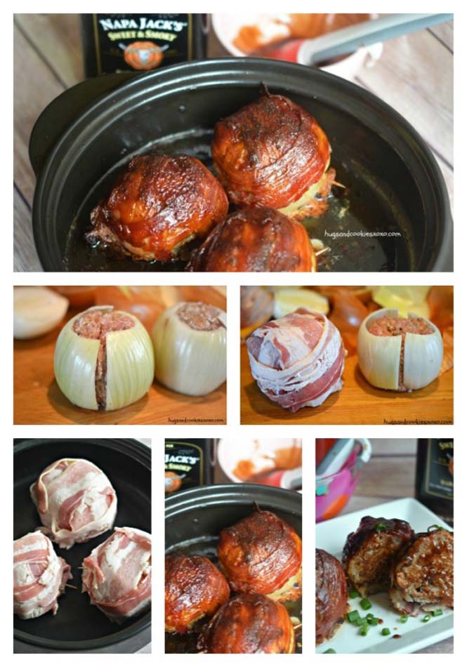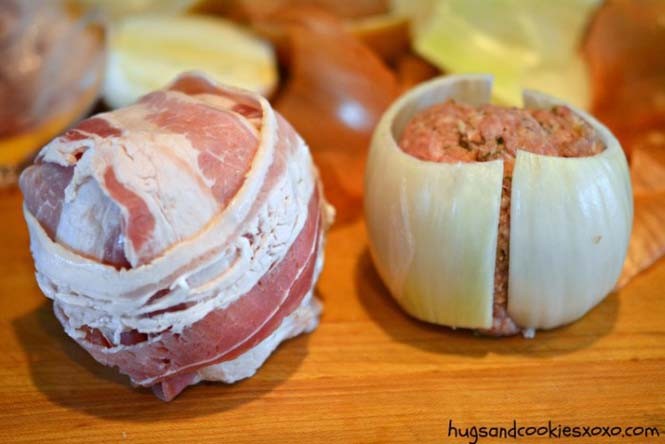 Ουσιαστικά, αδειάζετε μερικά κρεμμύδια και τα γεμίζετε με κιμά, στη συνέχεια τα τυλίγετε με μπέικον και τα ρίχνετε στον φούρνο.