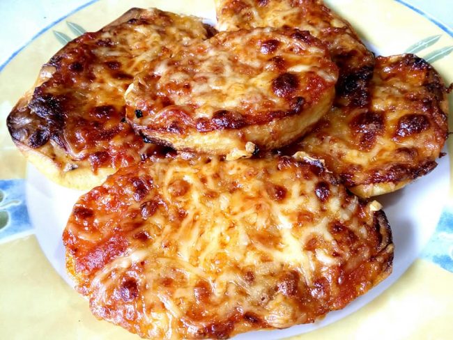 Μελιτζάνες στη λαδόκολλα με σάλτσα και τυριά, ψημένες στον φούρνο σαν πιτσάκια – Εικόνα 1
