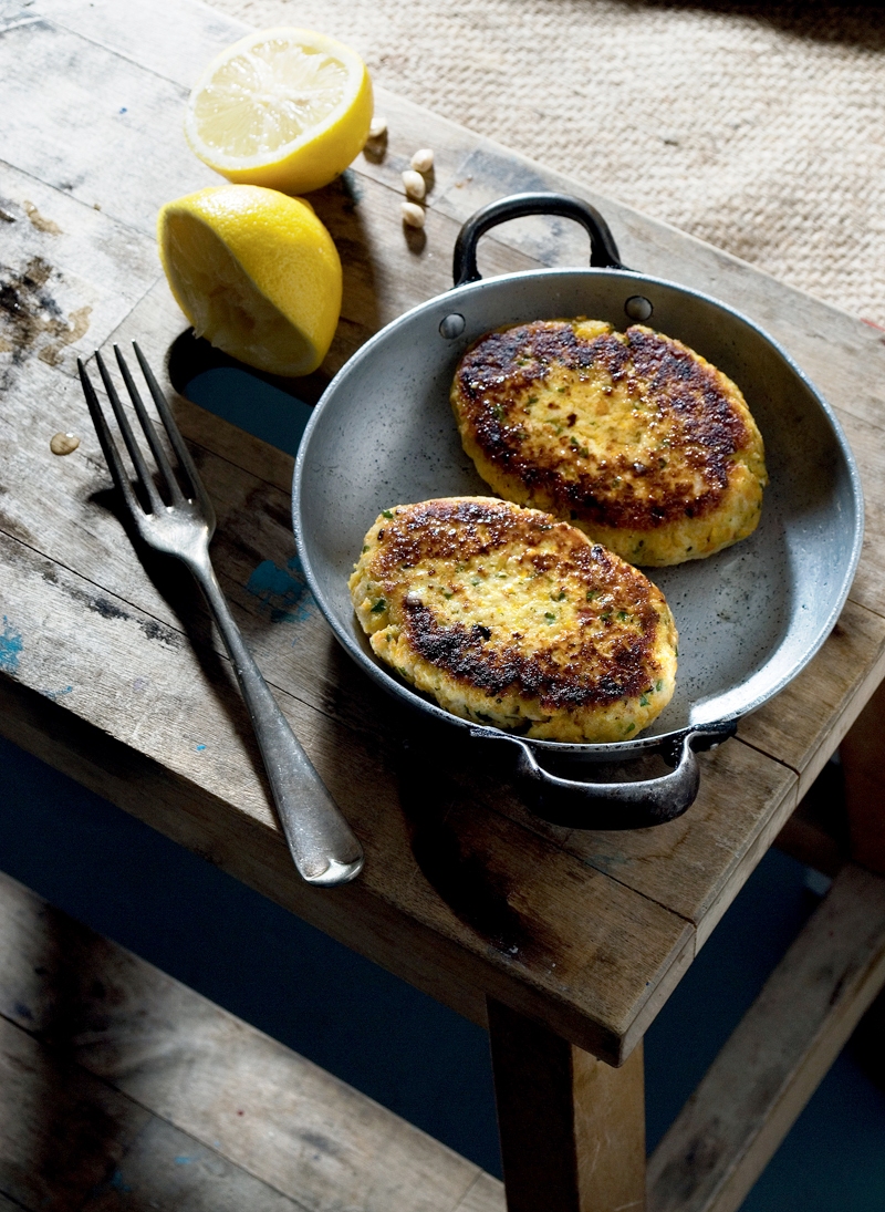 Aν το μείγμα δεν βγει αρκετά σφιχτό, προσθέτουμε αλεύρι και το αφήνουμε στο ψυγείο. Πλάθουμε σε μπιφτέκια, τα λαδώνουμε και τα ψήνουμε σε καυτό αντικολλητικό τηγάνι για 7-8 λεπτά και από τις δύο πλευρές.Mε καλαμαράκια και σουπιές