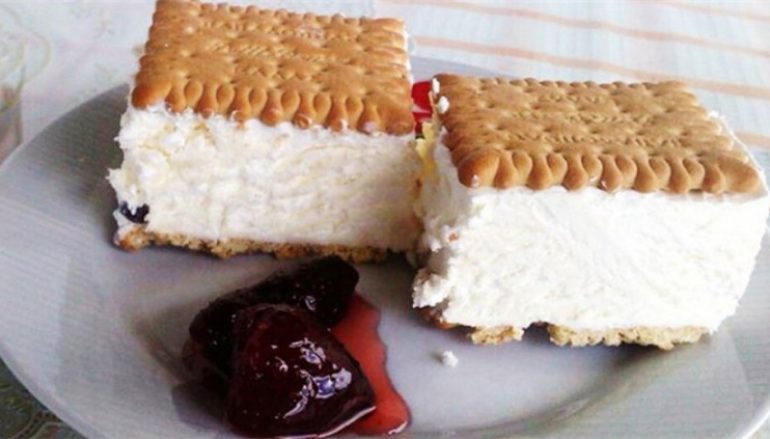Στρώνω σ΄ενα πυρέξ μία στρώση μπισκότα, χτυπάω όλα τα υλικά με το μίξερ και περιχύνω το μίγμα πάνω απο τα μπισκότα τέλος βάζω απο πάνω άλλη μία στρώση μπισκότα.