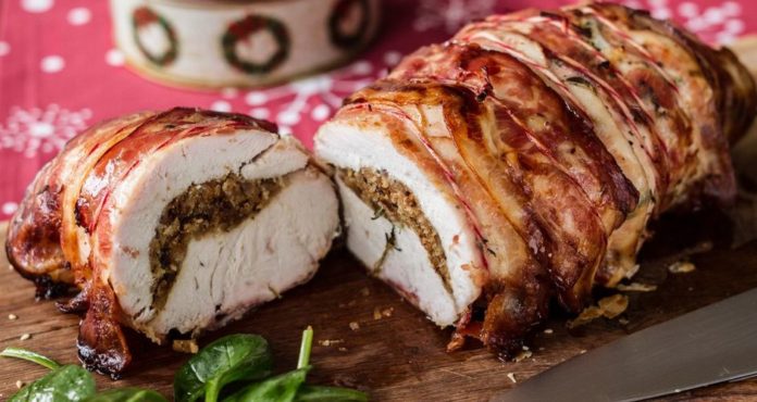 - Βάζουμε τις φέτες μπέικον πάνω από τη γαλοπούλα από τη μία πλευρά και πάνω από κάθε μπέικον βάζω από ένα σχοινάκι.