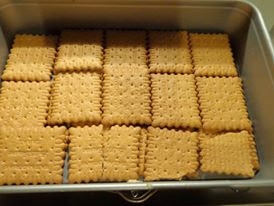 Σε ένα μικρό ταψί απλώνουμε τα μπισκότα τύπου πτι μπερ σε δύο σειρές, χωρίς να τα βρέξουμε.