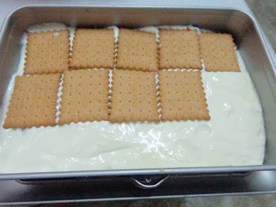 Στη συνέχεια βάζουμε τη μισή ποσότητα κρέμας πάνω από τα μπισκότα που έχουμε ήδη τοποθετήσει στο ταψί και έπειτα στρώνουμε πάλι δύο στρώσεις μπισκότα, όπως και προηγουμένως.