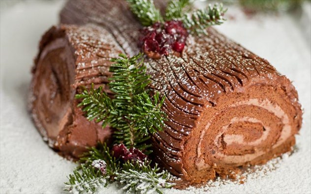 Η όψη του θυμίζει κυριολεκτικά κορμό δέντρου, ενώ ουσιαστικά, πρόκειται για ένα ελβετικό κέικ-ρολό γεμιστό και επικαλυμμένο με σοκολάτα.
