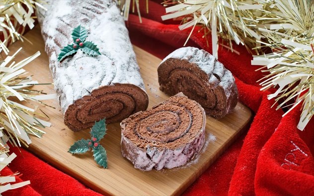 Η όψη του θυμίζει κυριολεκτικά κορμό δέντρου, ενώ ουσιαστικά, πρόκειται για ένα ελβετικό κέικ-ρολό γεμιστό και επικαλυμμένο με σοκολάτα.