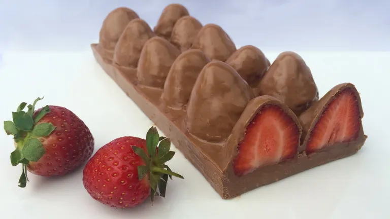Βουτήξτε σχεδόν μέχρι την κορυφή κάθε φράουλας, και αφήστε τις όρθιες σε ένα ταψί.
