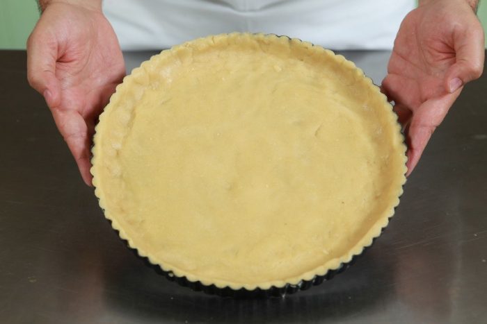 Παγωµένη όπως είναι η ζύµη την ανοίγουµε σε φύλλο µε χοντρό πλάστη είτε ανάµεσα σε δύο λαδόκολλες είτε σε ελαφρώς αλευρωµένη επιφάνεια. Το πάχος της δεν πρέπει να ξεπερνά τα 3-4 χιλιοστά και πρέπει όταν τη στρώνουµε σε βουτυρωµένη ταρτιέρα 26 εκ. να καλύπτει και τα τοιχώµατα και να εξέχει λίγο. Με τη βοήθεια του πλάστη ανασηκώνουµε τη ζύµη και τη στρώνουµε στην ταρτιέρα.