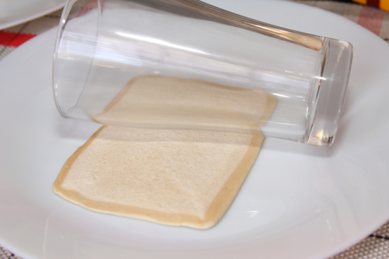 - Με τη βοήθεια ενός πλάστη ή ενός ποτηριού, ισιώνουμε και λεπταίνουμε τις φέτες του τόστ. Τις αλείφουμε με βούτυρο* τοποθετούμε επάνω από, μια φέτα τσένταρ και μια ζαμπόν και τις τυλίγουμε σε ρολά. Τα σταθεροποιούμε με τη βοήθεια οδοντογλυφίδας.
