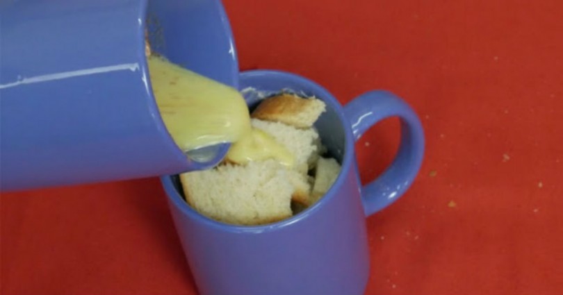 2. Κόψε το ψωμί σε κομματάκια και βάλτα στην κούπα που έχεις