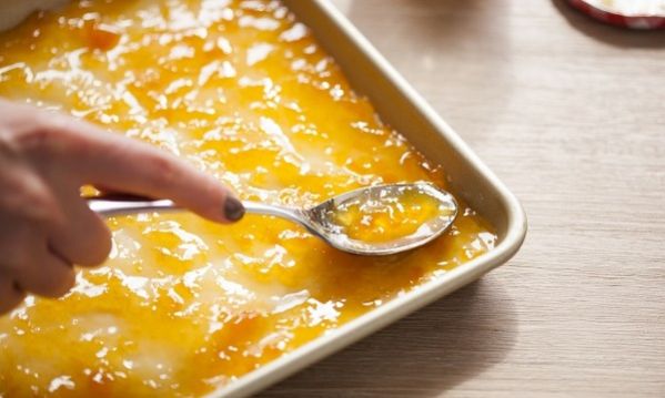 – Όταν πήξει,΄ριξτε το πάνω στα μπισκότα και έπειτα απλώστε ακόμα μία στρώση με μπισκότα. Σε ένα κατσαρολάκι βάλτε την υπόλοιπη κρέμα, ένα ποτήρι ζάχαρη και την πορτοκαλάδα και αφήστε το να βράσει σε χαμηλή φωτιά.