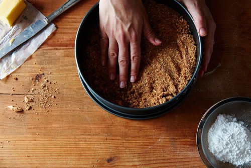 Απλώστε το μείγμα σε ένα τσέρκι διαμέτρου 23 εκατοστών και πιέστε στη βάση, είτε χρησιμοποιώντας τα χέρια σας ή το πίσω μέρος ενός κουταλιού. Τοποθετήστε στο ψυγείο τη βάση για να ξεκουραστεί.