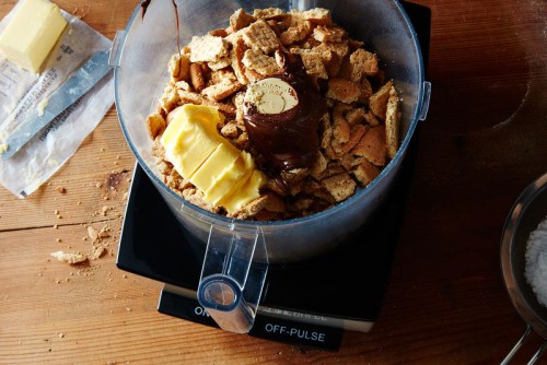 Σπάστε τα μπισκότα σε ένα μεγάλο μπολ, προσθέστε το βούτυρο και μια κουταλιά της σούπας από τη Νutella που έχετε. Ανακατέψτε καλά με κουτάλα ή σε ένα μίξερ. Προσθέστε 25 γραμμάρια / 3 κουταλιές της σούπας από τα φουντούκια και συνεχίστε μέχρι να έχετε ένα υγρό, αμμώδες μείγμα.