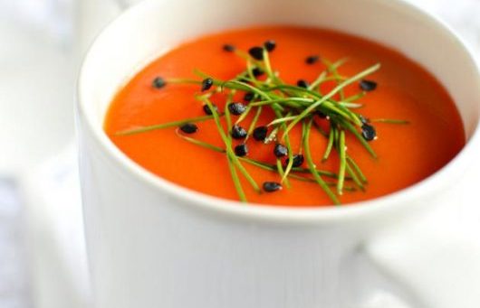 6 Σέρβιρε σε φλιτζάνια, προσθέτοντας μια κουταλιά γιαούρτι και ανακάτεψε. Πασπάλισε με μαύρο σουσάμι και μερικά φυλλαράκια chives.