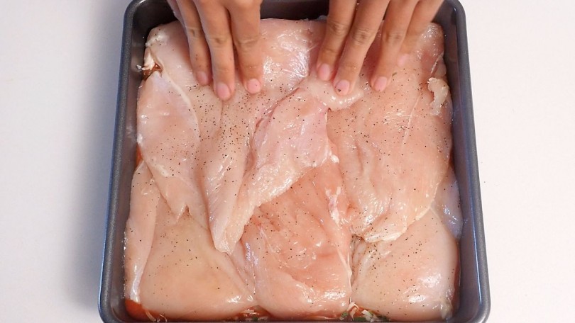 2. Βάζουμε και στις δύο πλευρές του κοτόπουλου αλάτι και πιπέρι και στη συνέχεια το τοποθετούμε ομοιόμορφα στο ταψί, πάνω από τη μοτσαρέλα