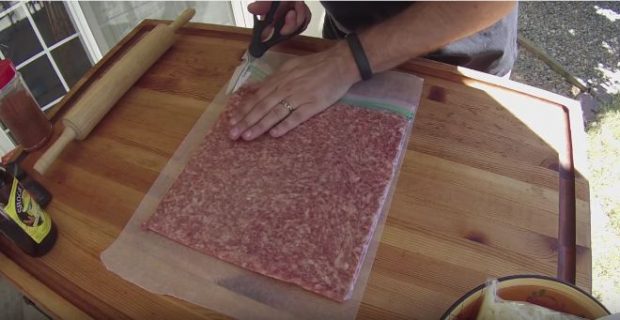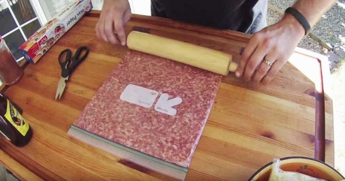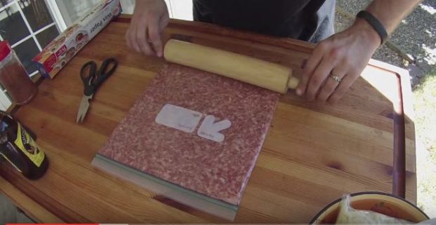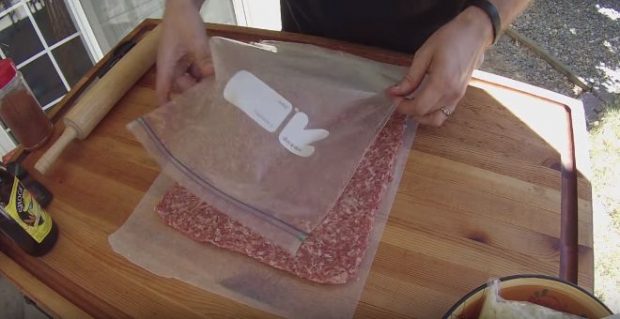 Ξεκινήστε απλώνοντας τον κιμά μέσα στη σακούλα και πιέζοντάς το.