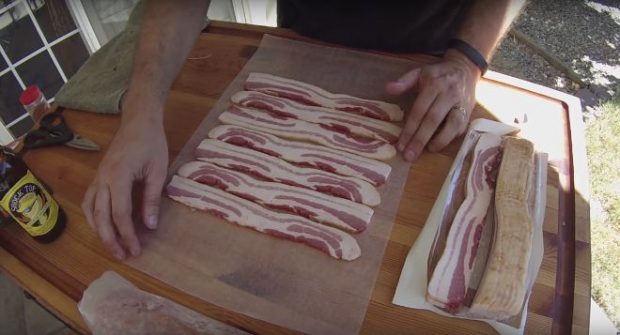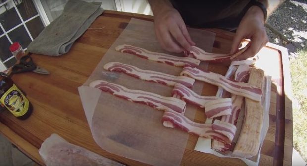 Απλώστε 7 φέτες bacon τη μία πάνω από την άλλη, πάνω σε ένα άλλο κομμάτι από λαδόχαρτο…