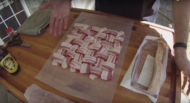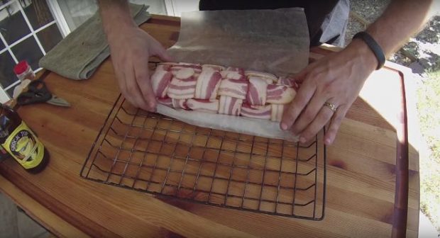 Βάλτε προσεκτικά το ρολό πάνω στο πλέγμα από bacon και τυλίξτε το.