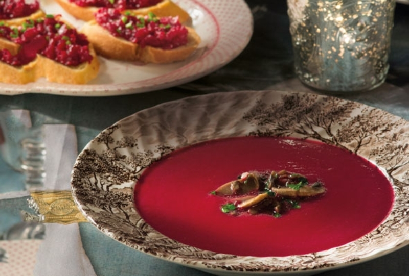 Σερβίρισμα: Σερβίρουμε τη σούπα στα πιάτα, από πάνω βάζουμε από 1-2 κουταλιές μανιτάρια και στο πλάι το φρυγανισμένο ψωμί αλειμμένο με το βούτυρο παντζαριού.